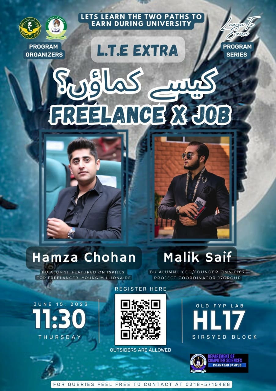 Iqbal Chair Bahria University and Shaheen e Iqbal invite all Bahrians to an exclusive session of ‘LTE Extra’ (Learn to Learn) after the successful conduction of six-week-long series of workshops under the Learn to Earn (LTE) Program.