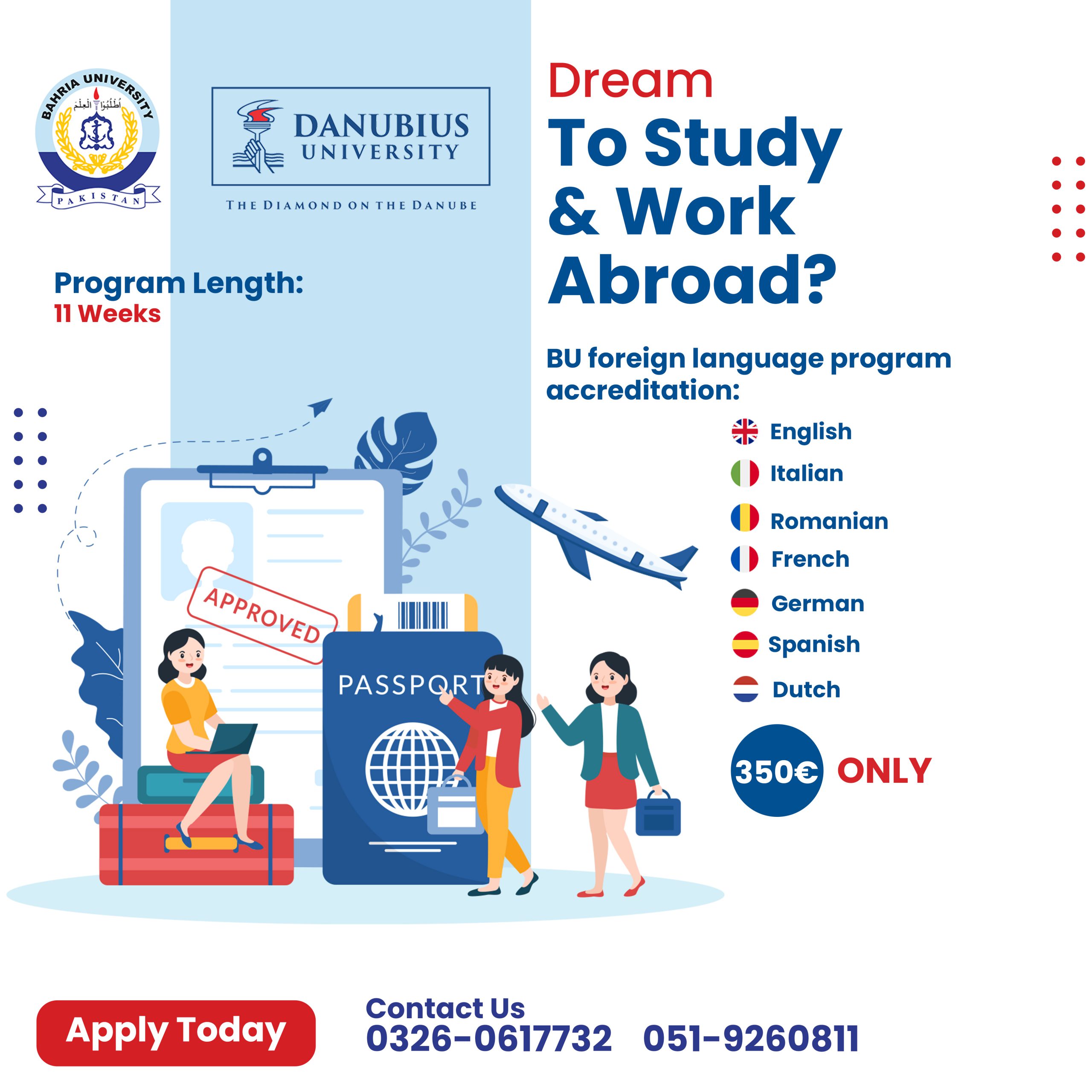 Danubius University and Bahria University bring you a Foreign Accredited Languages Program. Enhance your global career prospects with courses in English, Italian, Spanish, Romanian, French, German, and Dutch.
