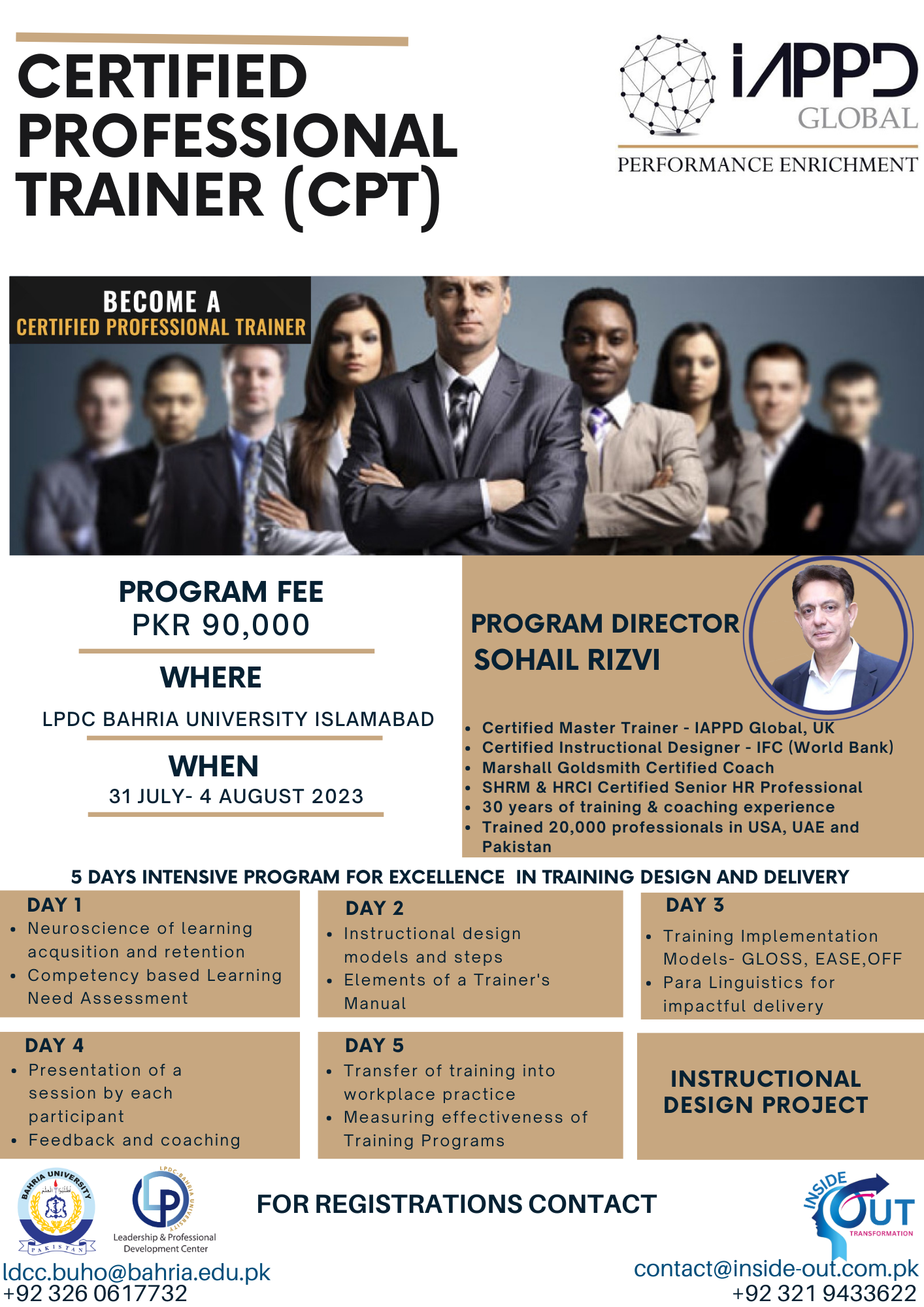 LPDC, Bahria University Islamabad is pleased to announce International Certificate Course titled “Certified Professional Trainer (CPT)” in collaboration with IAPPD Global & Inside Out Transformation.