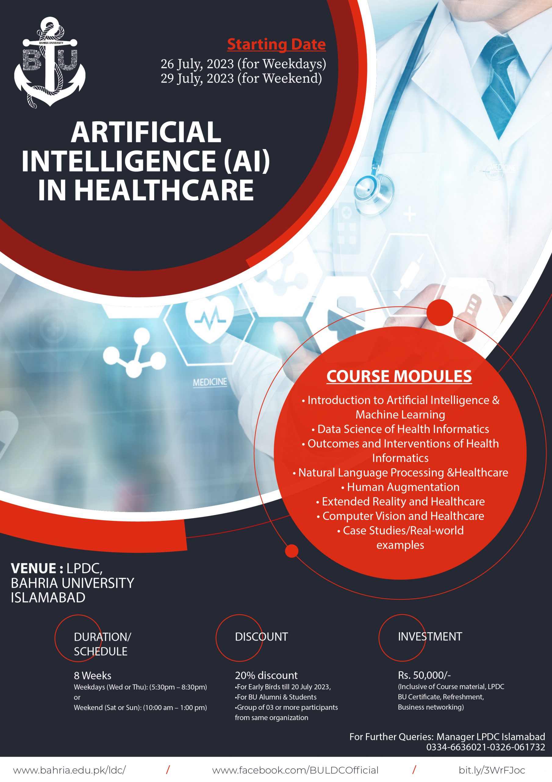 Leadership & Professional Development Centre, Bahria University is pleased to announce a cutting-edge certification in “Artificial Intelligence in Healthcare” Join us as we dive into the future of healthcare with AI!