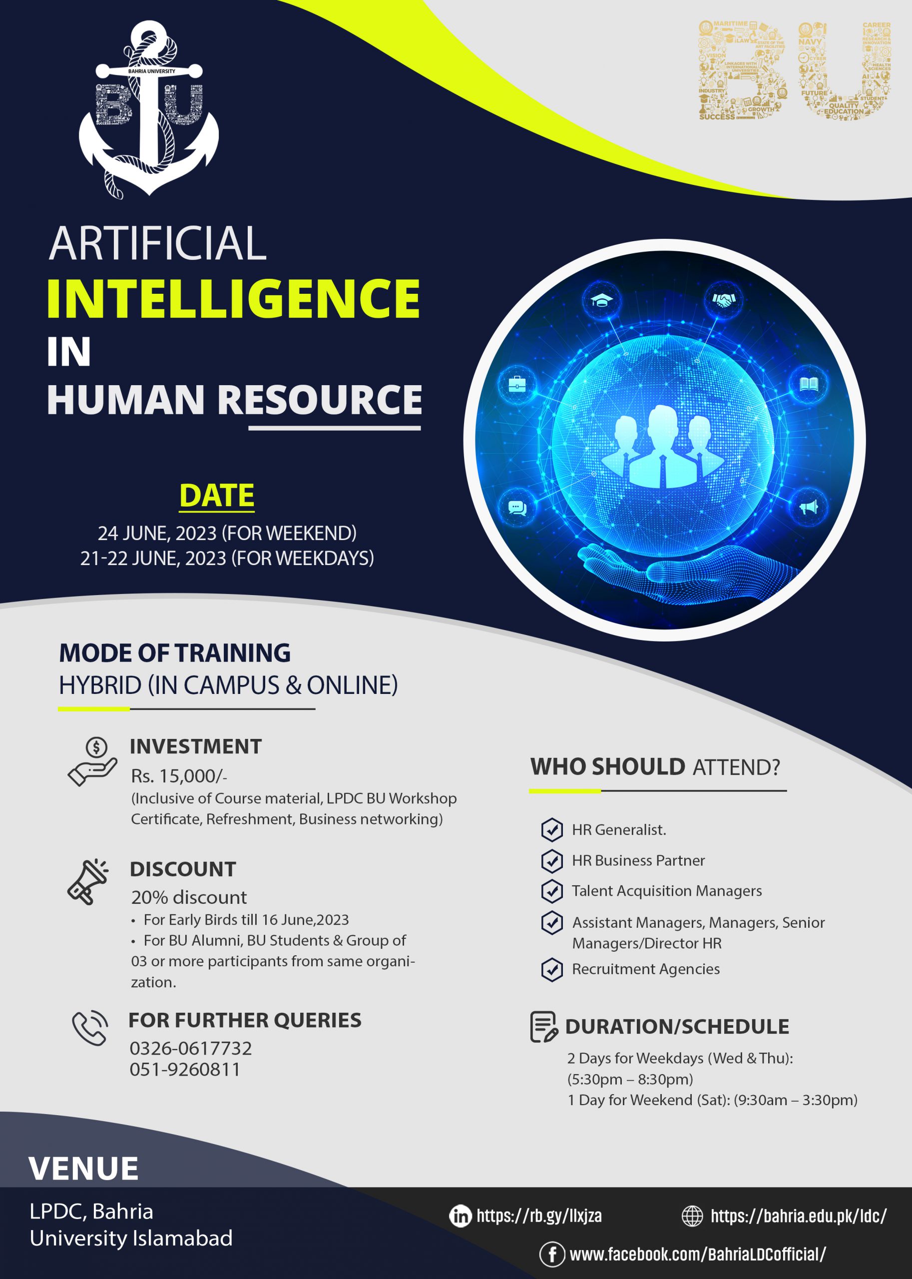 Bahria University proudly presents its groundbreaking training program in “Artificial Intelligence in Human Resource”. Prepare to revolutionize Human Resource Management with Artificial Intelligence! Join us on this incredible journey towards a smarter, more efficient workforce.