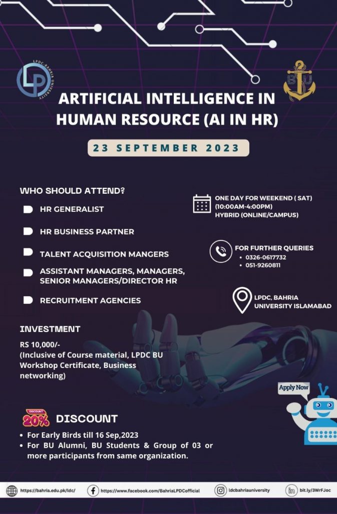 Leadership & Professional Development Centre, Bahria University is pleased to announce a cutting-edge certification in “Artificial Intelligence in Human Resource.” Join us as we dive into the future of Human Resource with AI!