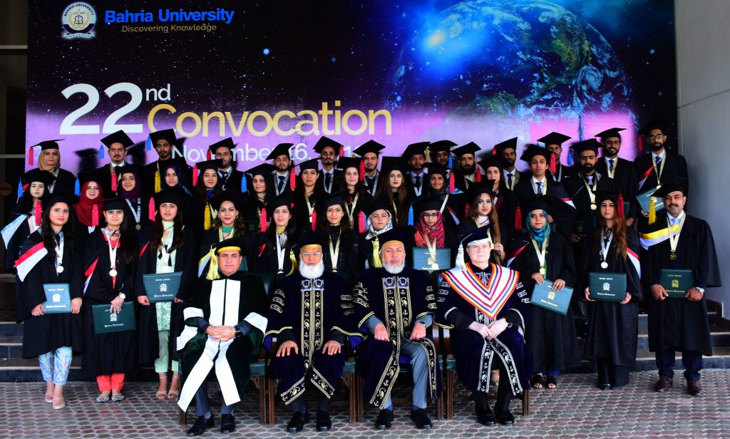 Bahria University Islamabad Campus held its 22nd Convocation at Jinnah Convention Center Islamabad. Vice Admiral Kaleem Shaukat HI(M) graced the occasion as Chief Guest. Rector Bahria University Rear Admiral Habib ur Rehman HI (M) along with Vice Admiral conferred the degrees to graduating students of Ph.D., MPhil, Masters and Undergraduate programs.