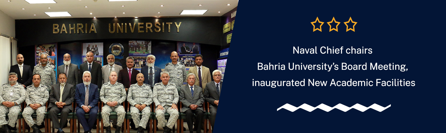 Last updated on October 28th, 2024 Chief of Naval Staff Admiral Zafar Mahmood Abbasi NI (M) chaired 42nd meeting of Board of Governors of Bahria University at BU Head Office Islamabad. A detailed briefing was given to the Board on progress of various ongoing projects, with special reference to growth and diversification in academic disciplines, … Continue reading Naval Chief chairs Bahria University’s Board Meeting, inaugurated New Academic Facilities