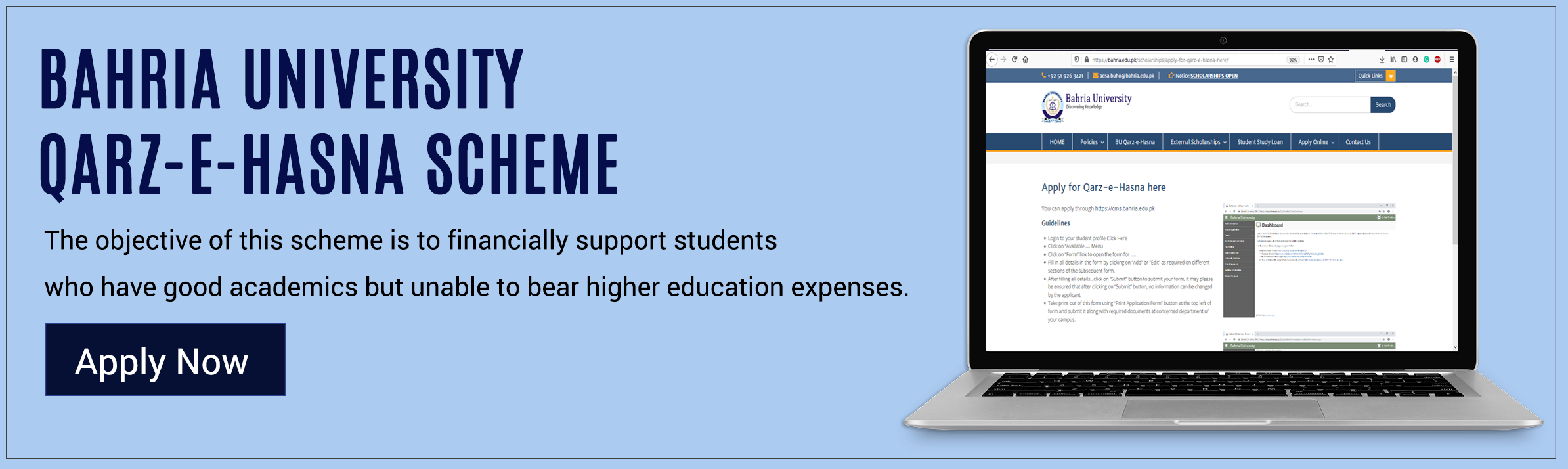 Last updated on October 28th, 2024Bahria University Qarz-e-Hasna Scheme for the students of all batches including Spring 2020 semester is announced. The objective of this scheme is to financially support students who have good academics but unable to bear higher education expenses. APPLY NOW THROUGH STUDENT PROFILE