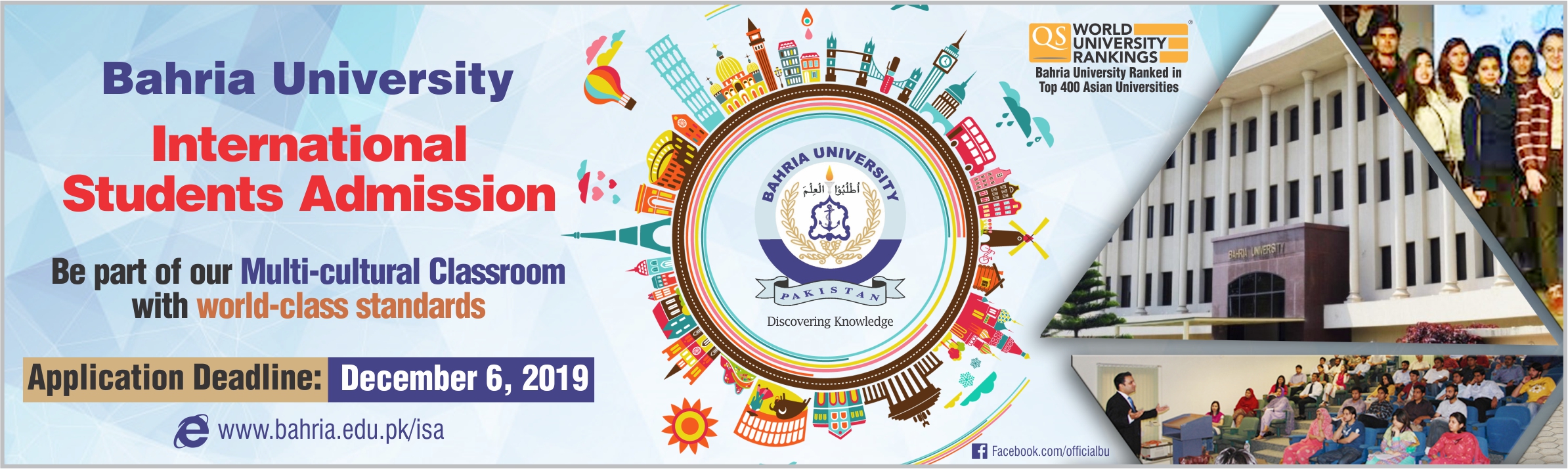 Last updated on January 1st, 2020Spring 2020 ADMISSIONS OPEN Apply Online Now Bahria University in Pakistan, a multi-campus recognized institute of higher education, located in the major cities Islamabad, Lahore & Karachi, WELCOMES INTERNATIONAL STUDENTS to pursue their educational journey at BU. Admissions Spring 2020 for International Students are open. Apply Now: https://archive.bahria.edu.pk/international-admissions/