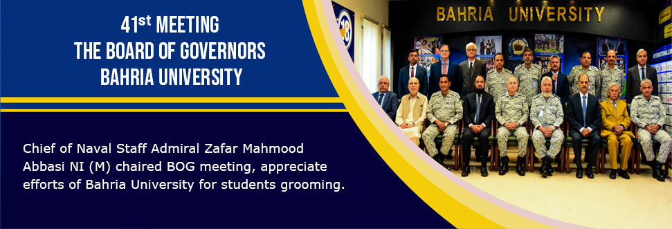 Last updated on October 28th, 2024 Chief of Naval Staff Admiral Zafar Mahmood Abbasi NI (M) chaired BOG meeting, appreciated efforts of Bahria University for students grooming. Islamabad: Chief of Naval Staff Admiral Zafar Mahmood Abbasi NI (M) chaired the 41st meeting of the Board of Governors of Bahria University at BU Head Office Islamabad. A detailed … Continue reading The 41st meeting of the Board of Governors of Bahria University