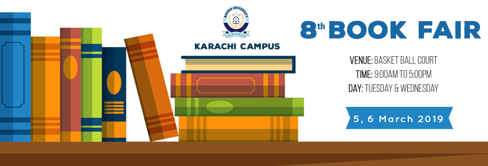 Last updated on March 18th, 2019Central Library at Bahria University Karachi Campus has organized 8th Book Fair Venue: Basket Ball Court Day: Tuesday & Wednesday Date: 5 & 6 March 2019 Time: 9:00AM to 5:00PM