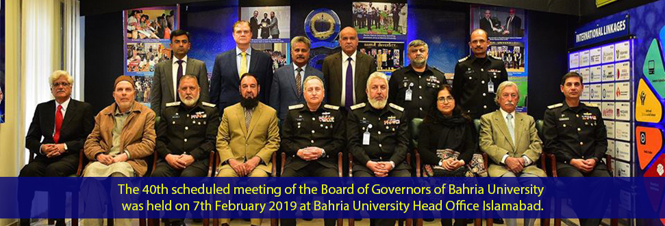 Last updated on July 31st, 2019The 40th scheduled meeting of the Board of Governors of Bahria University was held on 7th February 2019 at Bahria University Head Office Islamabad. The meeting was chaired by Admiral Zafar Mahmood Abbasi NI(M) Chief of the Naval Staff/ Pro-Chancellor and Chairman Board of Governors Bahria University and attended by … Continue reading 40th BU BOG Meeting