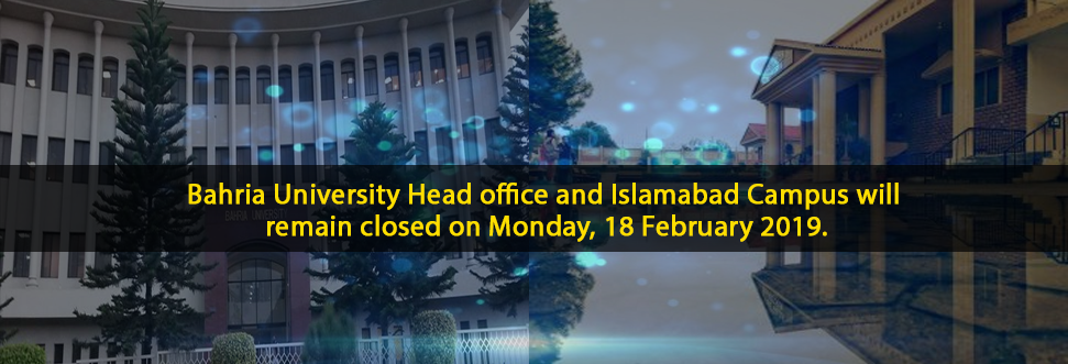 Last updated on February 20th, 2019Bahria University Head office and Islamabad Campus will remain closed on Monday, 18 February 2019.
