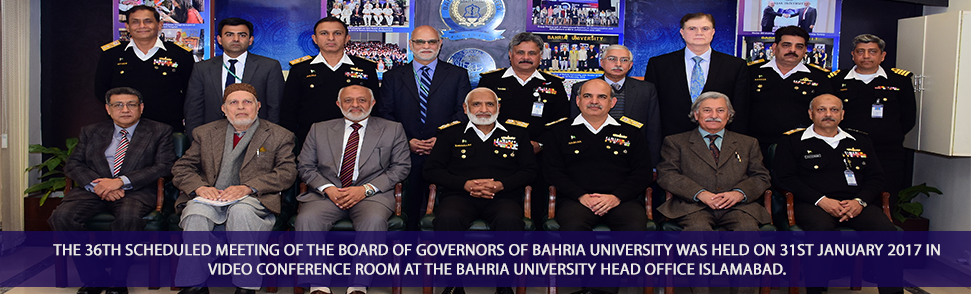 Last updated on June 7th, 2017The 36th scheduled meeting of the Board of Governors of Bahria University was held on 31st January 2017 in video conference room at the Bahria University Head Office Islamabad. The meeting was chaired by Admiral Muhammad Zakaullah NI (M), Chief of Naval Staff/ Pro-Chancellor and Chairman Board of Governors Bahria … Continue reading Naval Chief chairs Bahria University Board of Governors Meeting (BOG)