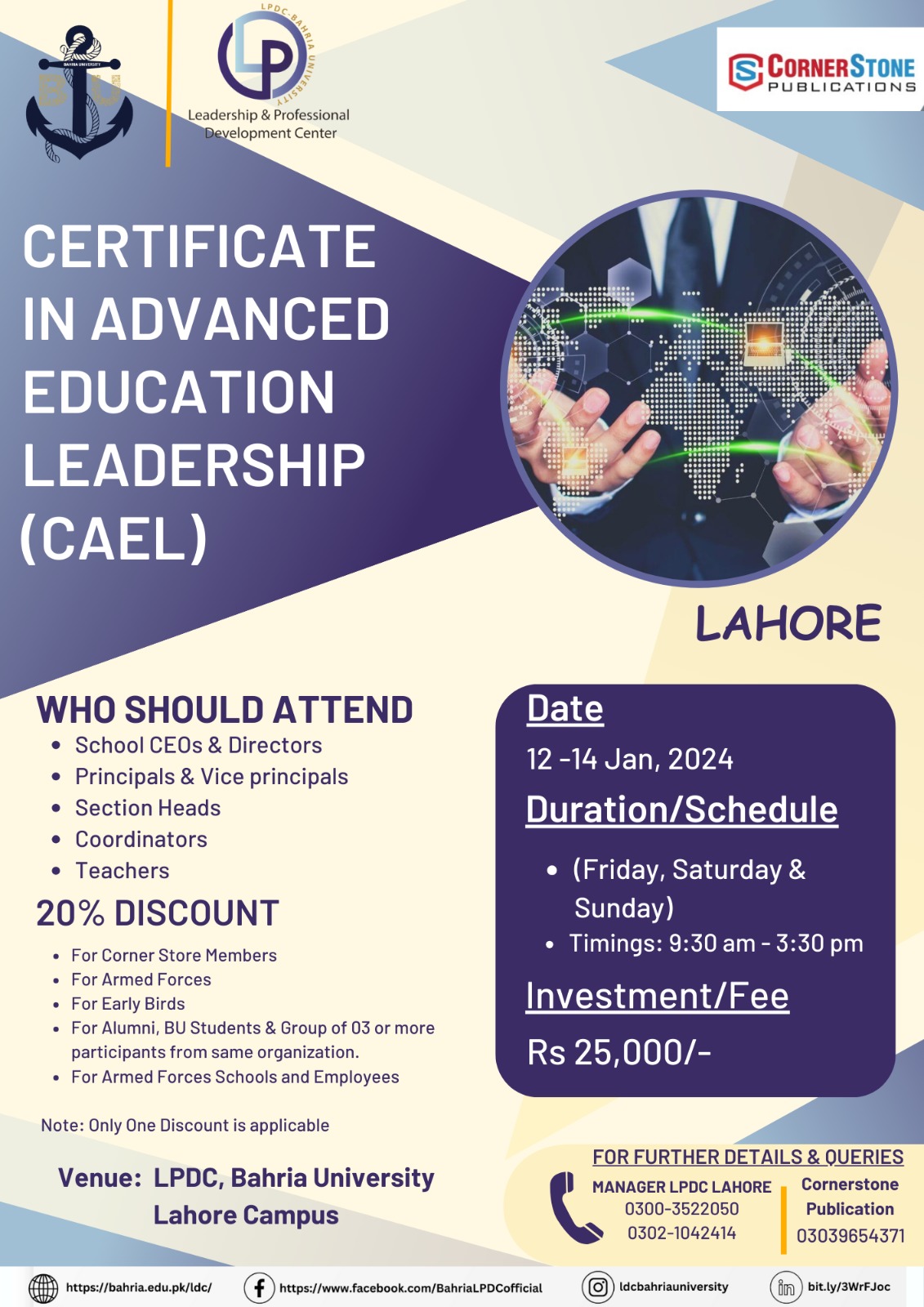 Bahria University proudly announces the launch of the game-changing ‘Certificate in Advanced Education Leadership (CAEL)’ in collaboration with Cornerstone Publications. Elevate your leadership skills in the education sector with cutting-edge insights and practical knowledge. Join us on this transformative journey! #CAELDuration: 3 Days(Friday, Saturday & Sunday)(9:30am – 3:30pm)Investment: Rs. 25,000/- (Inclusive of Course material, LPDC BU Workshop Certificate, Refreshment, Business networking)Venue: LPDC, Bahria University LahoreWho Should Attend?School CEOs & DirectorsPrincipals & Vice principalsSection HeadsCoordinatorsTeachersDiscount: 20% discount• For Cornerstone Members• For Armed Forces• For Early Birds• For Alumni, BU Students & Group of 03 or more participants from same organization.• For Armed Forces Schools and EmployeesNote: Only One Discount is applicableRegister now: https://forms.gle/3fiMQF7M13CNrLT77 Account Details for Fee Submission:Bank Alfalah Islamic Johar Town LahoreAccount Title: Professional Development Short Courses (PDSC)Account Number: 55105000763083For Further Queries (BULC): Manager LPDC Lahore0300-3522050/0302-1042414Cornerstone Publications03039654371