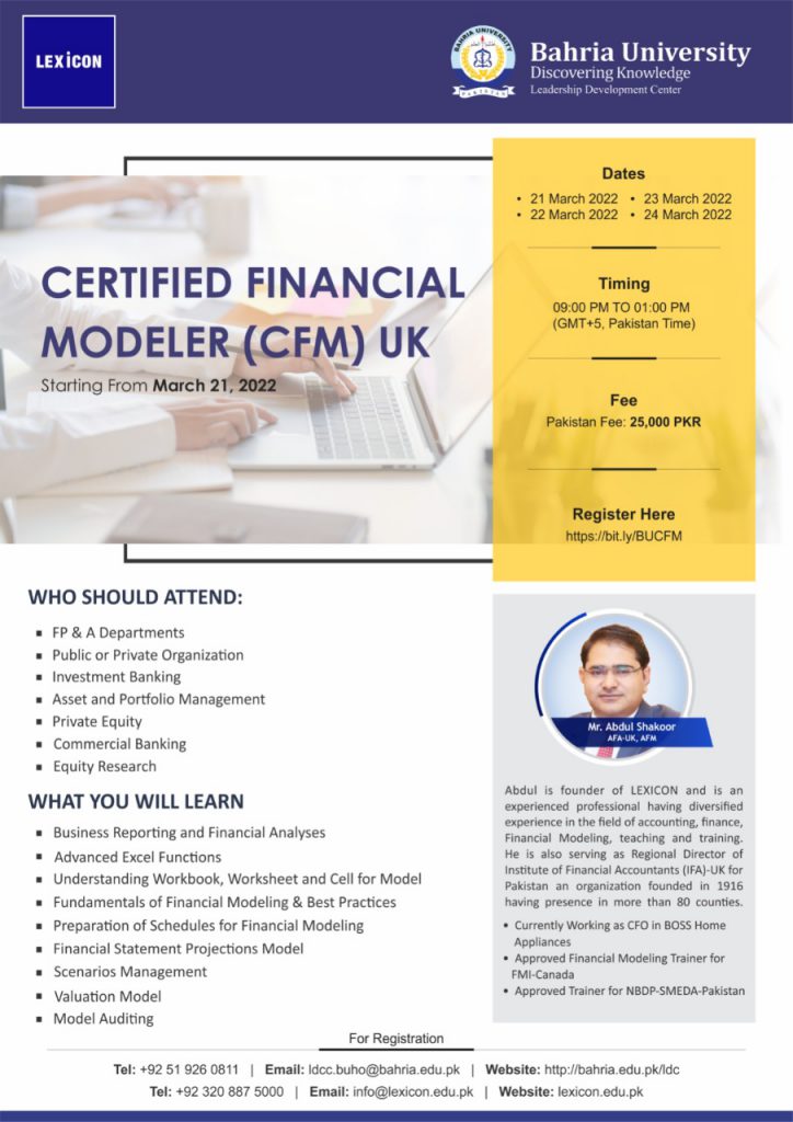 Bahria University, Leadership Development Centre in collaboration with LEXICON is pleased to offer a training program ” Certified Financial Modeler (CFM)-UK” at Bahria University Islamabad