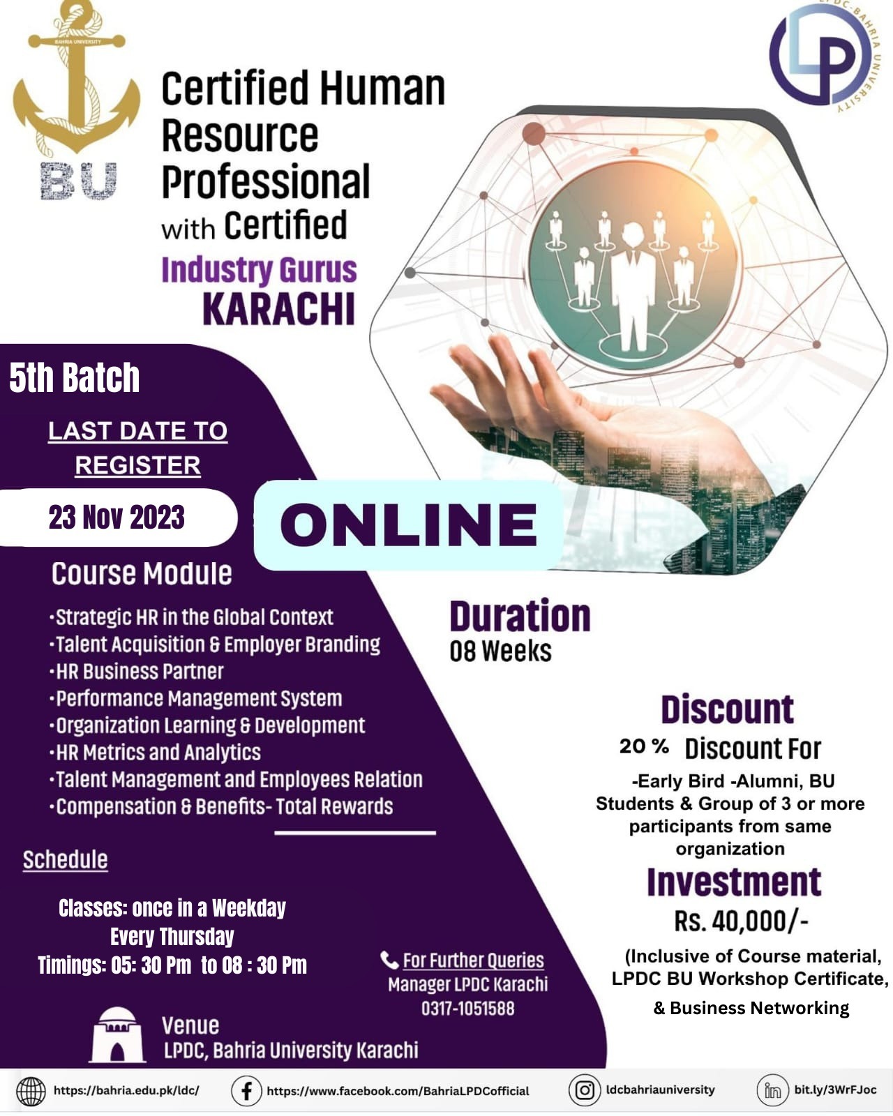 Leadership & Professional Development Centre (LPDC) Bahria University is pleased to announce its 5th batch of “Certified Human Resource Professional (CHRP) program” taught by certified industry gurus.  Unlock your potential and become an HR expert!