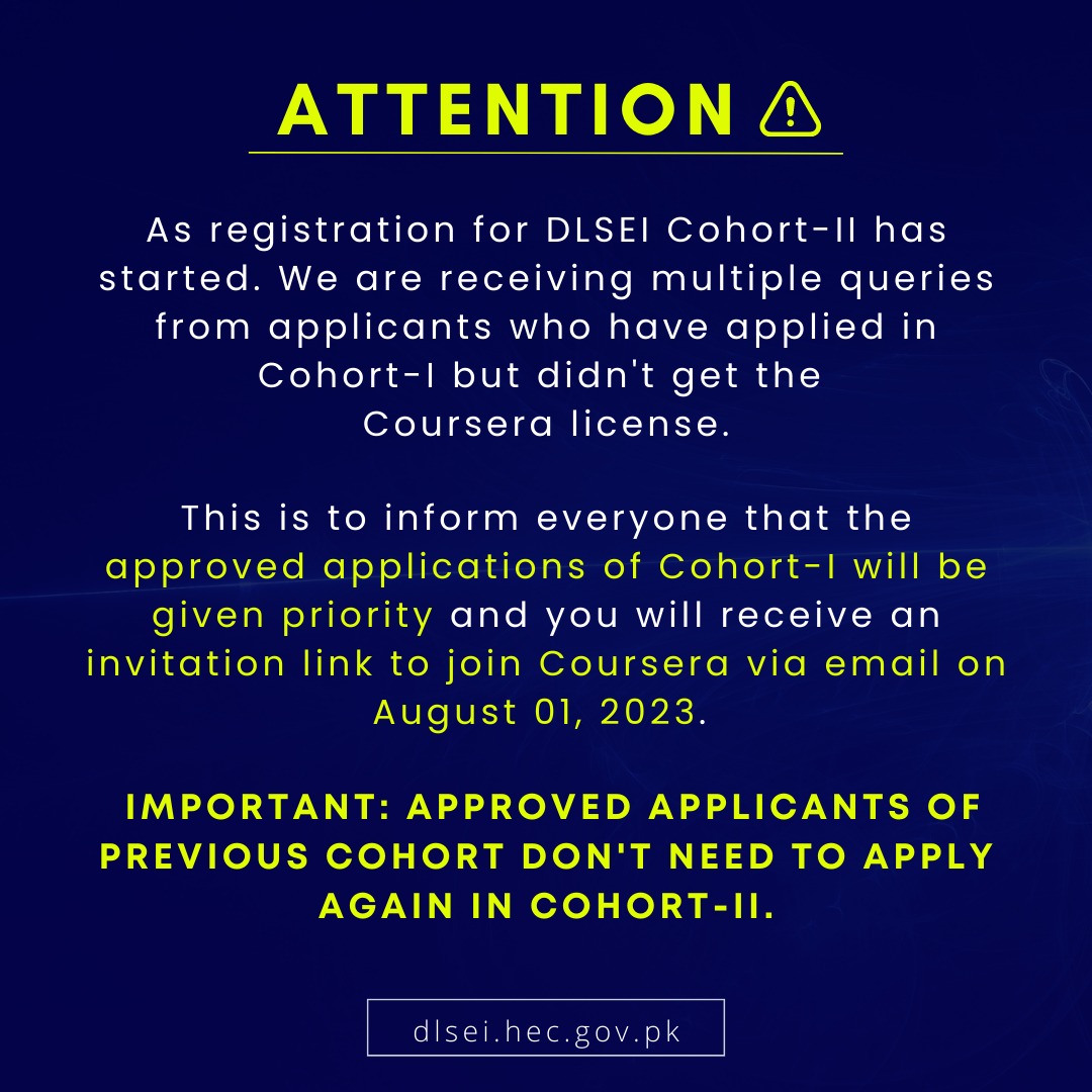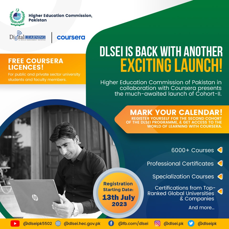 The HEC has initiated the Digital Learning & Skill Enrichment Initiative (DLSEI) in coordination with Coursera, an international virtual education giant. Under this program, Coursera license will be available free of cost to the students\faculty\staff of the public & private sector universities on a first come first serve basis. The program will provide various courses to the students and faculty online, helping them augment their learning in curricular courses and impart job-ready skills. The registrations for DLSEI Cohort-II are open.