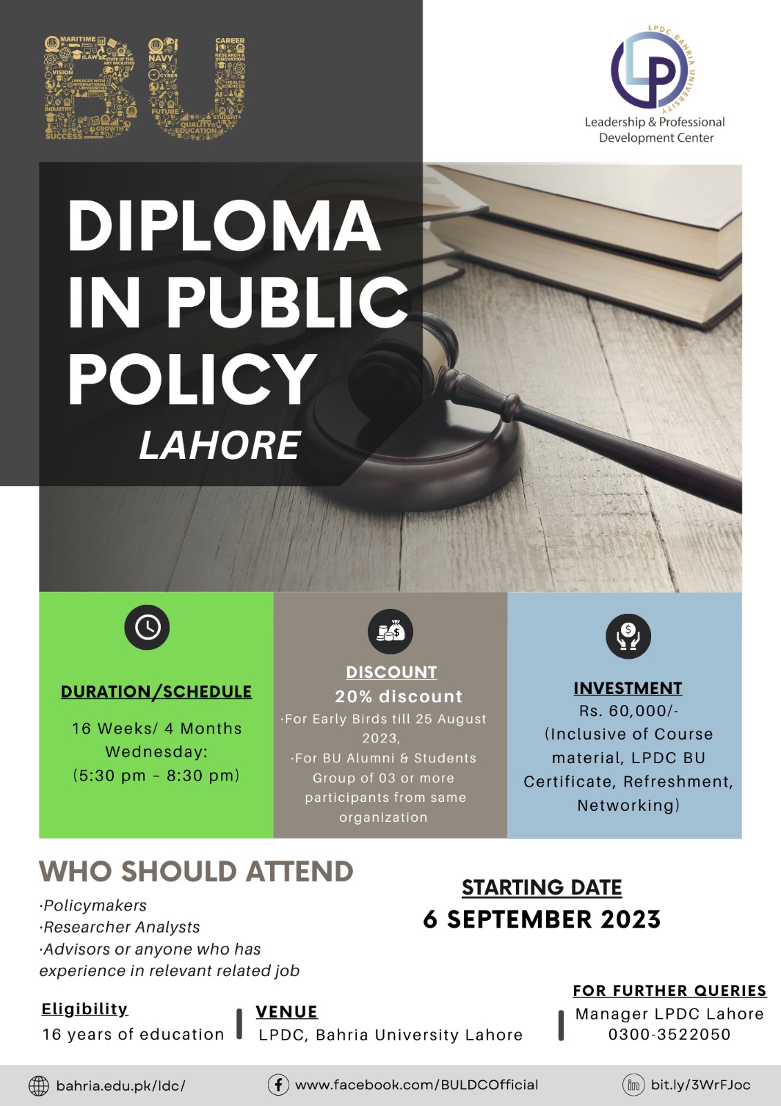 Join us at Bahria University’s Leadership & Professional Development Centre (LPDC) for a transformative journey through our ‘DIPLOMA IN PUBLIC POLICY’ program at Bahria University Lahore.