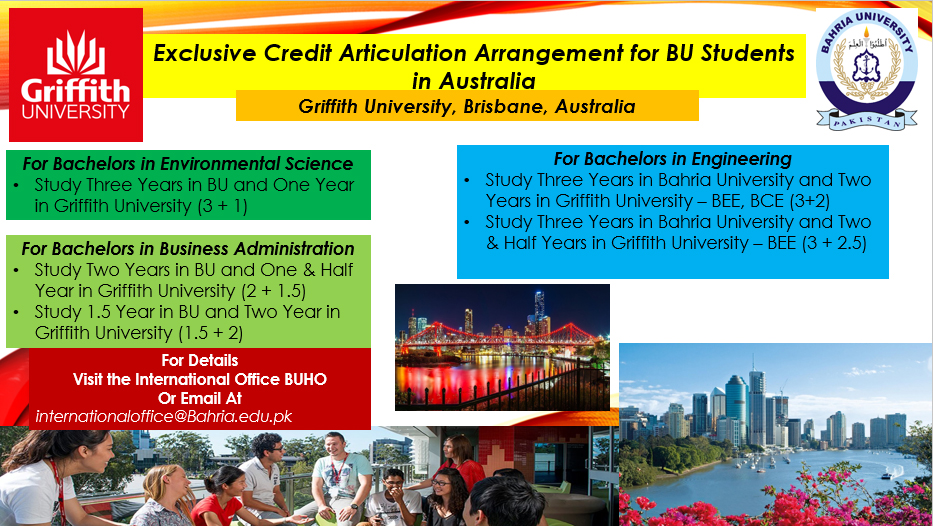 - Study Three Years in Bahria University and Two Years in Griffith University – BEE, BCE (3+2)