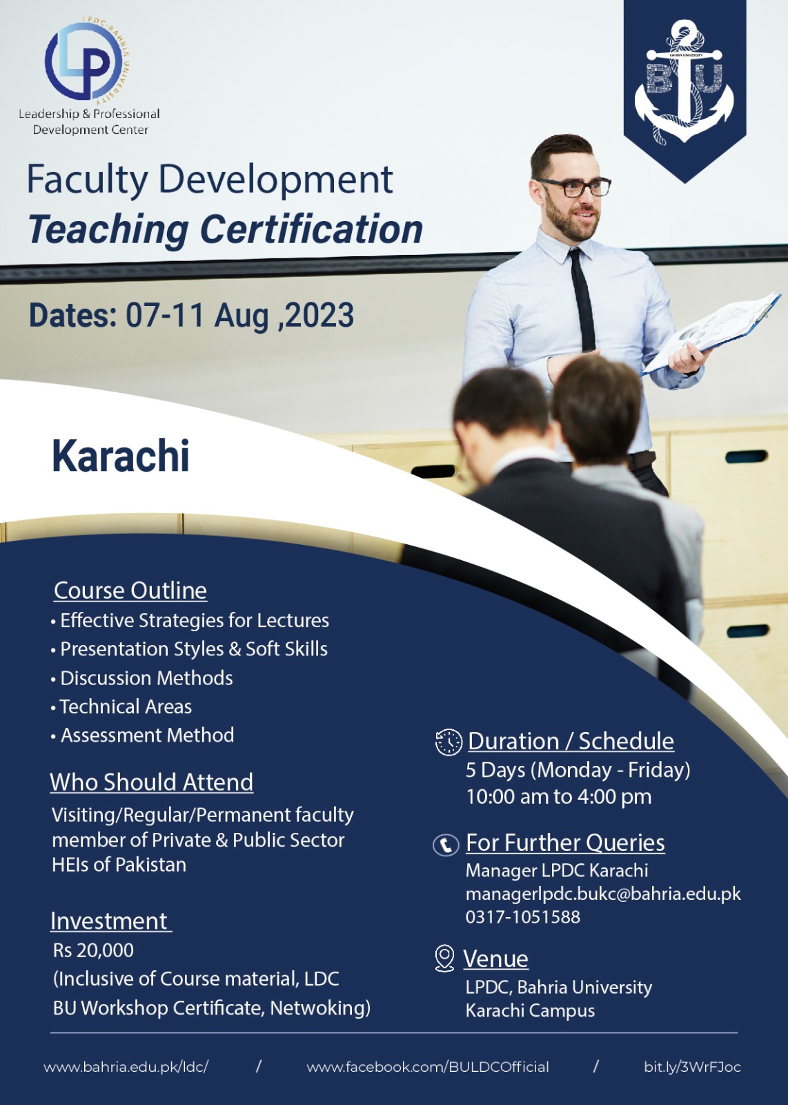 Bahria University Leadership & Professional Development Centre (LPDC), Karachi is pleased to announce the “Faculty Development Teaching Certificate” at BU Karachi.
