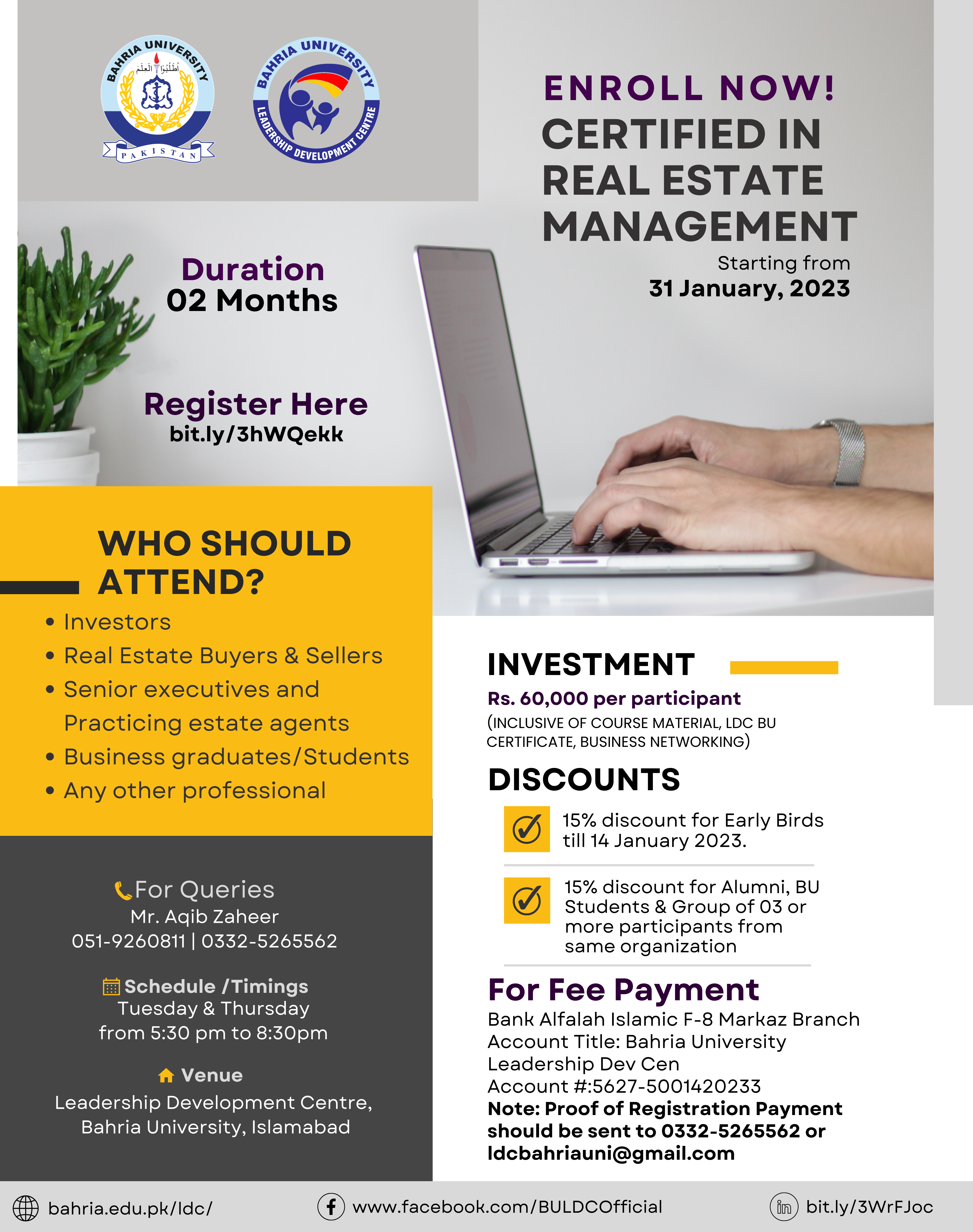 Bahria University Leadership Development Centre (LDC) is pleased to announce the Certificate program on Certified in Real Estate Management with Certified Industry Gurus.
