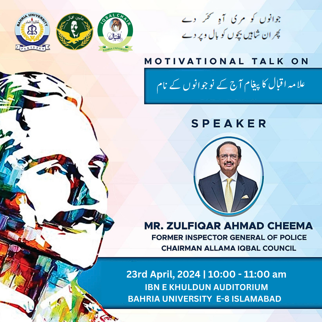 Join us for a motivational talk by Mr. Zulfiqar Ahmad Cheema as he explores the timeless wisdom of Allama Iqbal and its relevance for youth today.