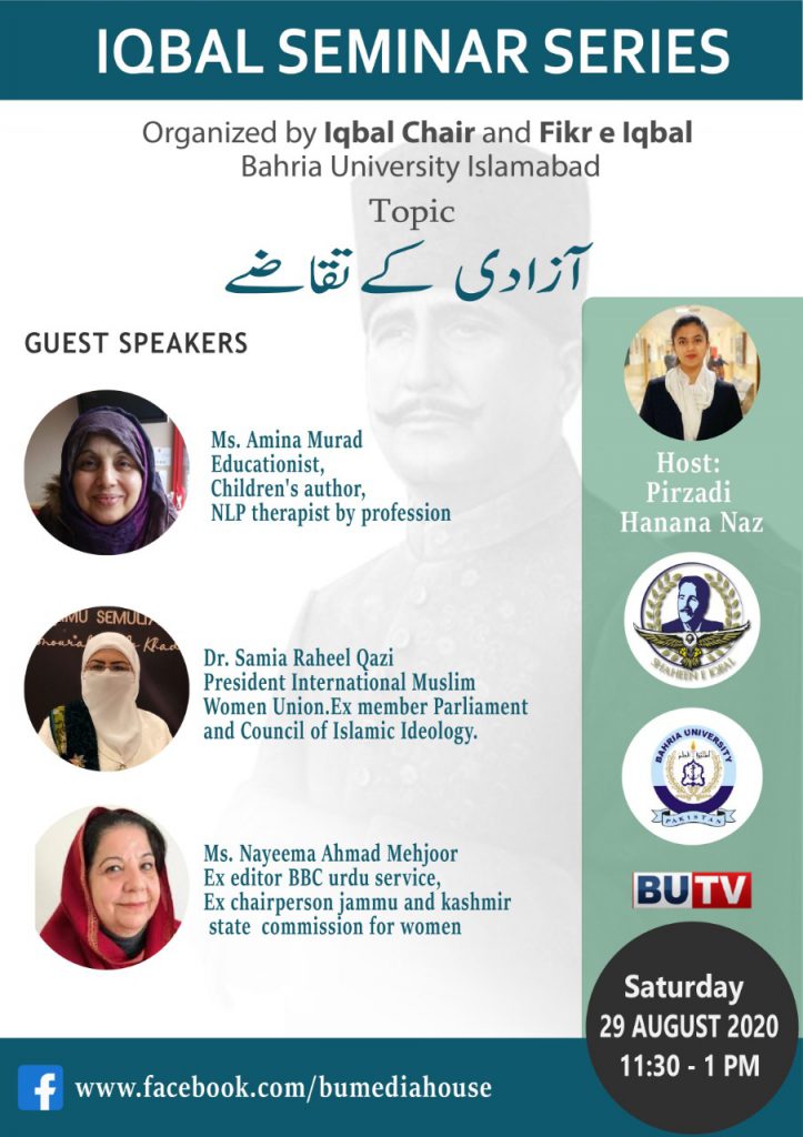 Iqbal Chair is honored to present the third program in Aazadi Episode of Iqbal Seminar Series, organized by Fikr e Iqbal, BUTV and Iqbal Chair Bahria University. Let us revisit the meaning and objective of Freedom (Aazadi) with three esteemed intellectual reformers.