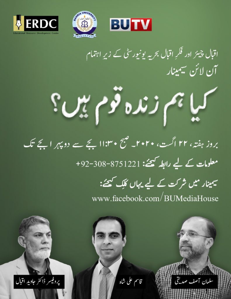 Under the auspices of Iqbal Seminar Series, Fikr e Iqbal, BUTV and Iqbal Chair Bahria University have the honor to avail the participation of Mr. Qasim Ali Shah, Dr Javed Iqbal and Mr. Salman Asif Siddiqui in an online panel discussion. Following are the details of this panel discussion: