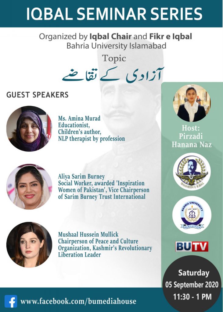 Iqbal Chair is honored to present the third program in Aazadi Episode of Iqbal Seminar Series, organized by Fikr e Iqbal, BUTV and Iqbal Chair Bahria University. Let us revisit the meaning and objective of Freedom (Aazadi) with three esteemed intellectual reformers. Following are the details of this panel discussion: