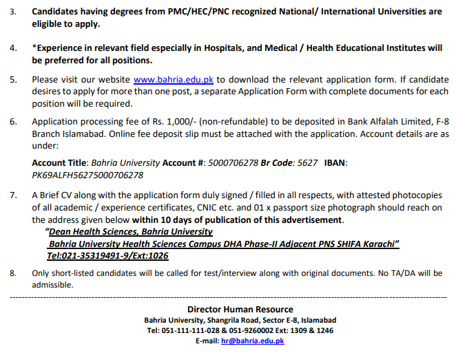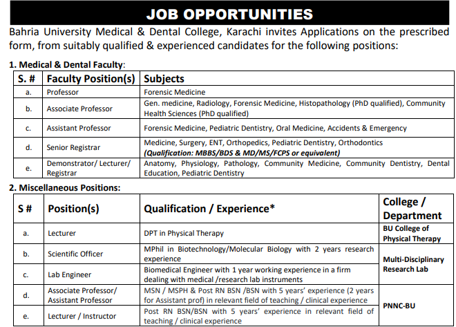 JOB OPPORTUNITIES : BAHRIA UNIVERSITY MEDICAL & DENTAL COLLEGE KARACHI