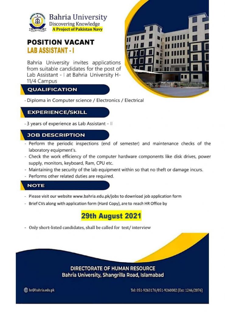 Position Vacant: Lab Assistant-I (H-11/4 Campus)