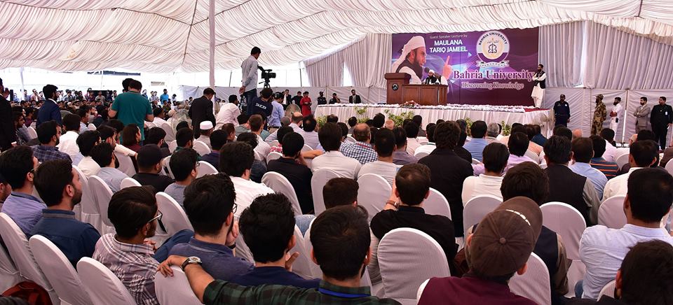 Renowned Islamic scholar Maulana Tariq Jameel delivered a spiritual talk at Bahria University Islamabad Campus today. The session was widely attended by students, faculty and staff. Emphasizing on teachings of Quran and Hadith, the scholar said that life without religion was empty, real pleasure and satisfaction could only be gained by putting Islamic guidelines into practice. He advised the students to learn the real purpose of their life and render services for humanity. Maulana urged the youth to obey parents and called upon parents to not forcefully implement their views on children.