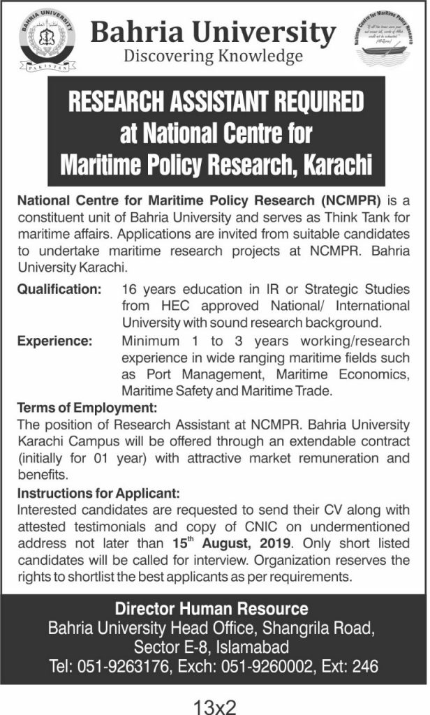 Situation Vacant : Research Assistant Required at NCMPR, Karachi