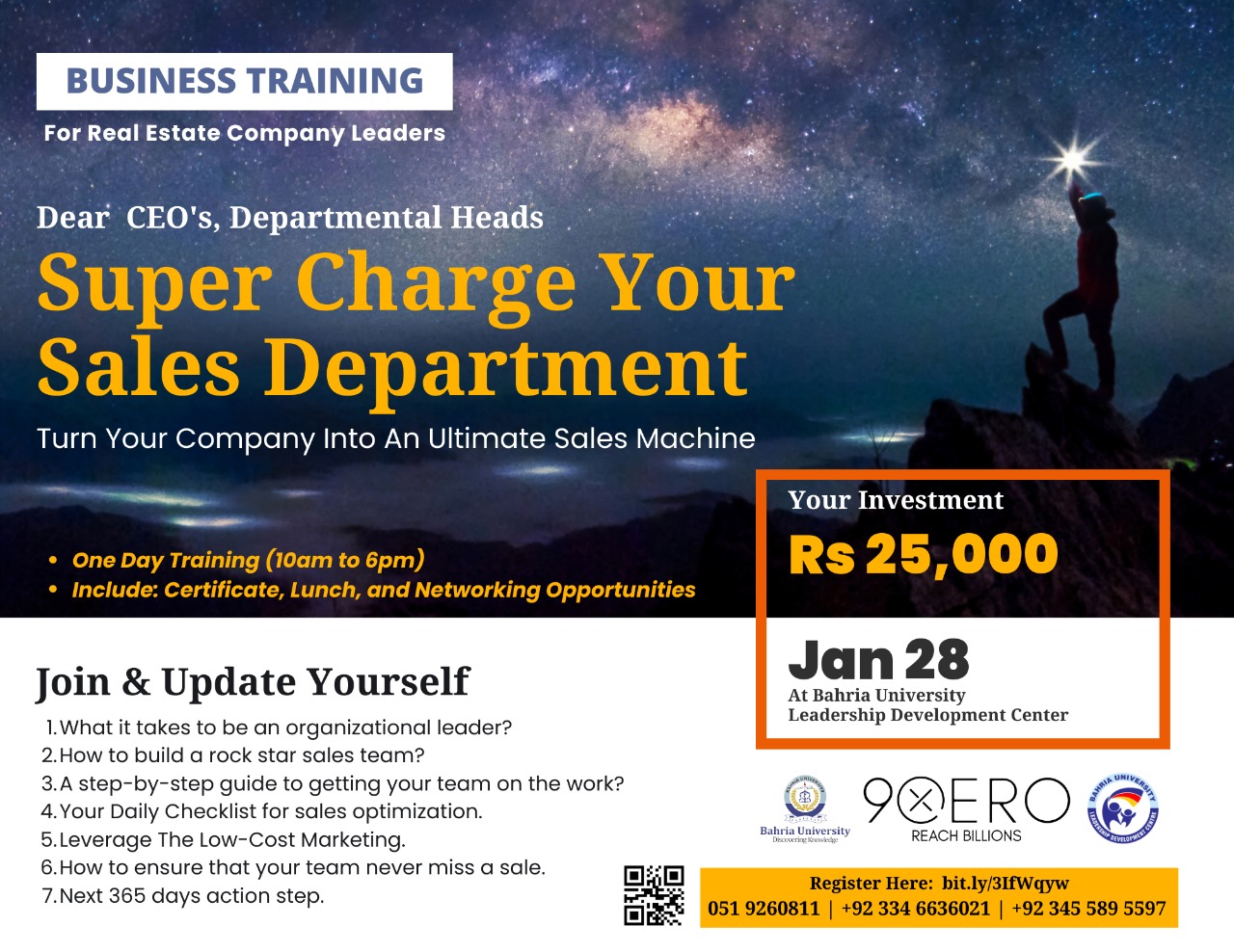 Leadership Development Centre in Collaboration with 9Xero Pvt Ltd are organizing a full-day strategic training on how to supercharge your sales department. You’ll leave this training with renewed confidence in your abilities and the tools you need to drive your company’s growth in 2023 and beyond.
