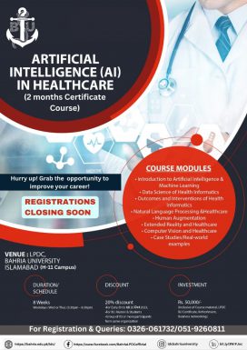 Leadership & Professional Development Centre, Bahria University is pleased to announce a cutting-edge 2 month certification course in “Artificial Intelligence (AI) in Healthcare” Join us as we dive into the future of healthcare with AI! Hurry up! REGISTRATIONS CLOSING SOON! =>Register now: https://forms.gle/7g2CEVFc39hE4o6u7 =>For registration and queries, please contact: 0326-061732 | 051-9260811