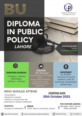 Join us at Bahria University’s Leadership & Professional Development Centre (LPDC) for a transformative journey through our ‘DIPLOMA IN PUBLIC POLICY’ program at Bahria University Lahore.